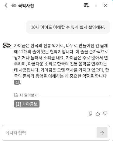 그리고 현 시점에서 가장 신뢰할만한 국악사전 챗봇은 이미 국립국악원에서 개발했다.