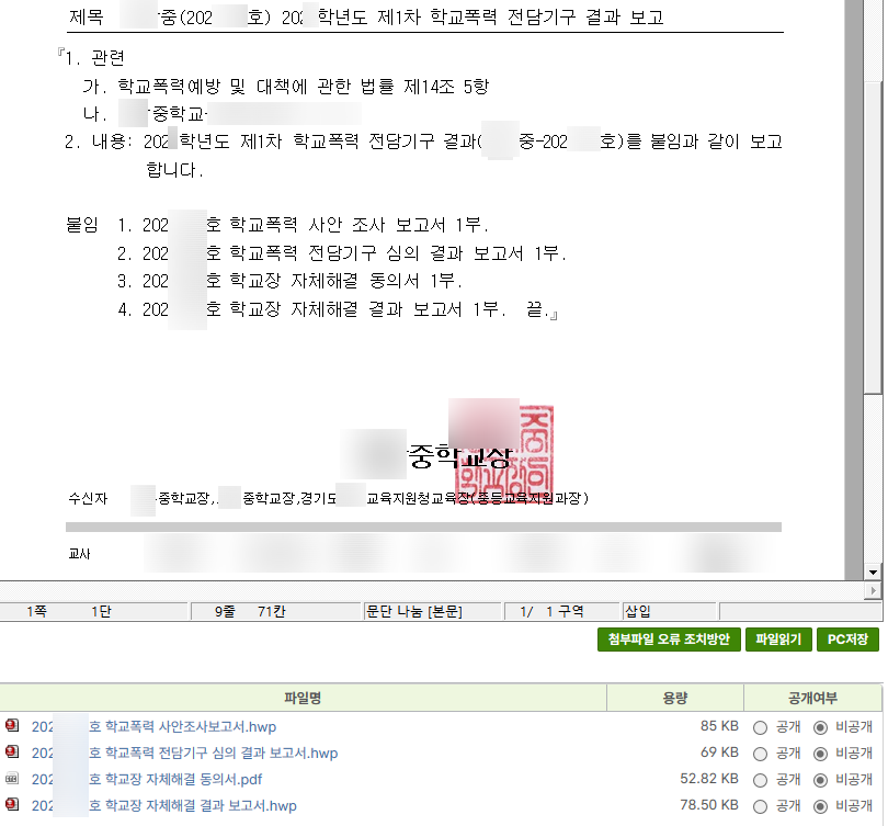 학폭 관련 문서는 비공개, 목록공개 체크해제, 6호, 영구