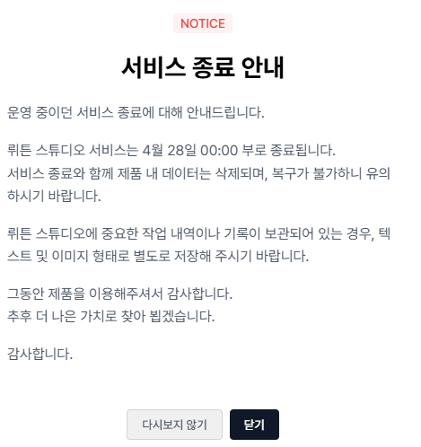 내가 사랑했던 뤼튼... 챗봇 서비스 정말 좋았는데 아쉽게도 이제 챗봇 스튜디오를 종료한다고 한다.