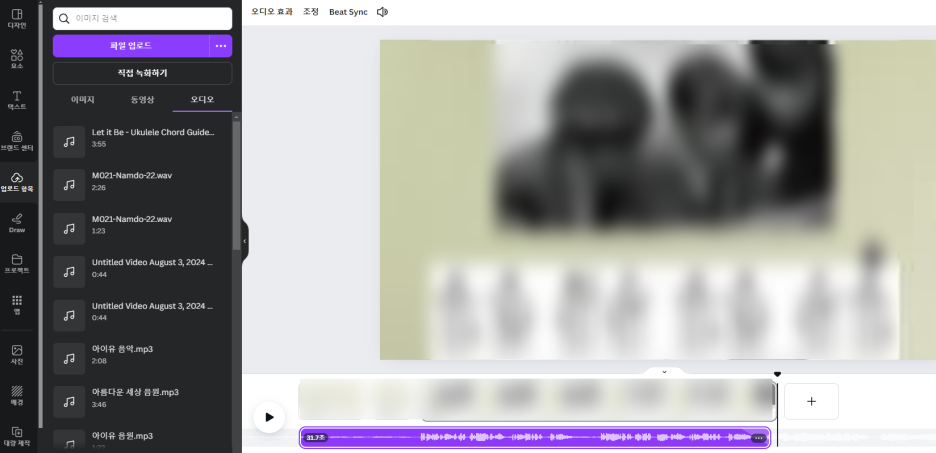 캔바 '동영상' 메뉴에서 오디오를 업로드하고, 화면으로 끌어내려서 음원 길이를 편집했다.