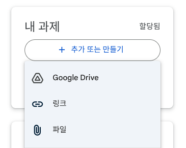 2. 구글 클래스룸에서 교사가 할당한 과제를 열고, 화면 오른쪽에 + 추가 또는 만들기를 클릭한다.