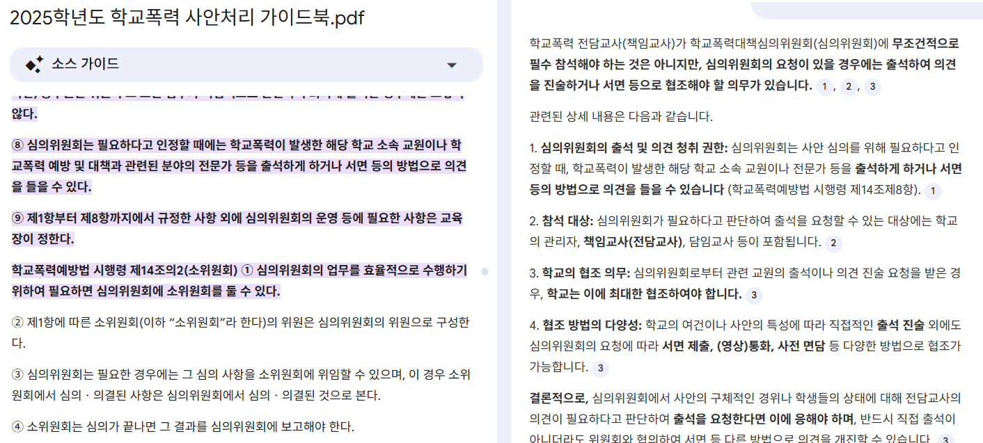 노트북LM에 경기도 교육청 학폭 가이드북을 업로드하고 질문했습니다.